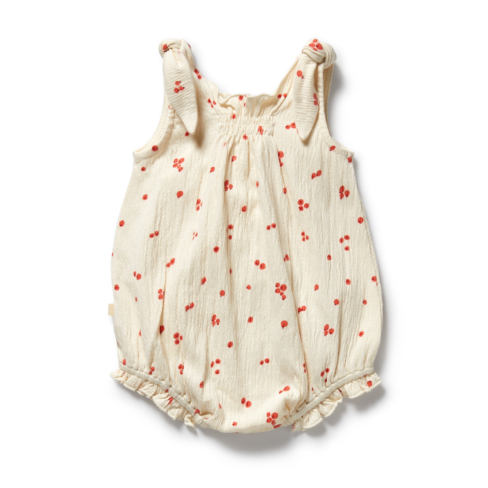 Sweet, soft, and perfect for sunny days – Wilson + Frenchy's Strawberry Kisses baby playsuit is a delightful everyday outfit for your little one. Made from breathable, lightweight fabric, this one-piece is designed with a relaxed fit to keep baby cool and comfy. Featuring mock tie straps, gentle shirring at the chest, and cute ruffles around the leg openings, it’s full of playful details. Finished in our fun and fruity strawberry kisses print, it’s a go-to for warm-weather adventures and everyday cuteness.