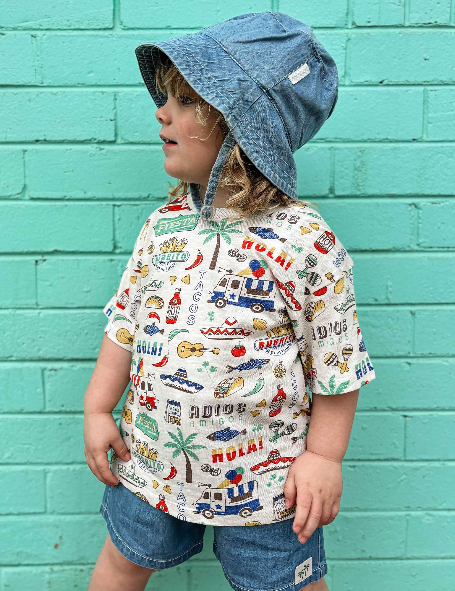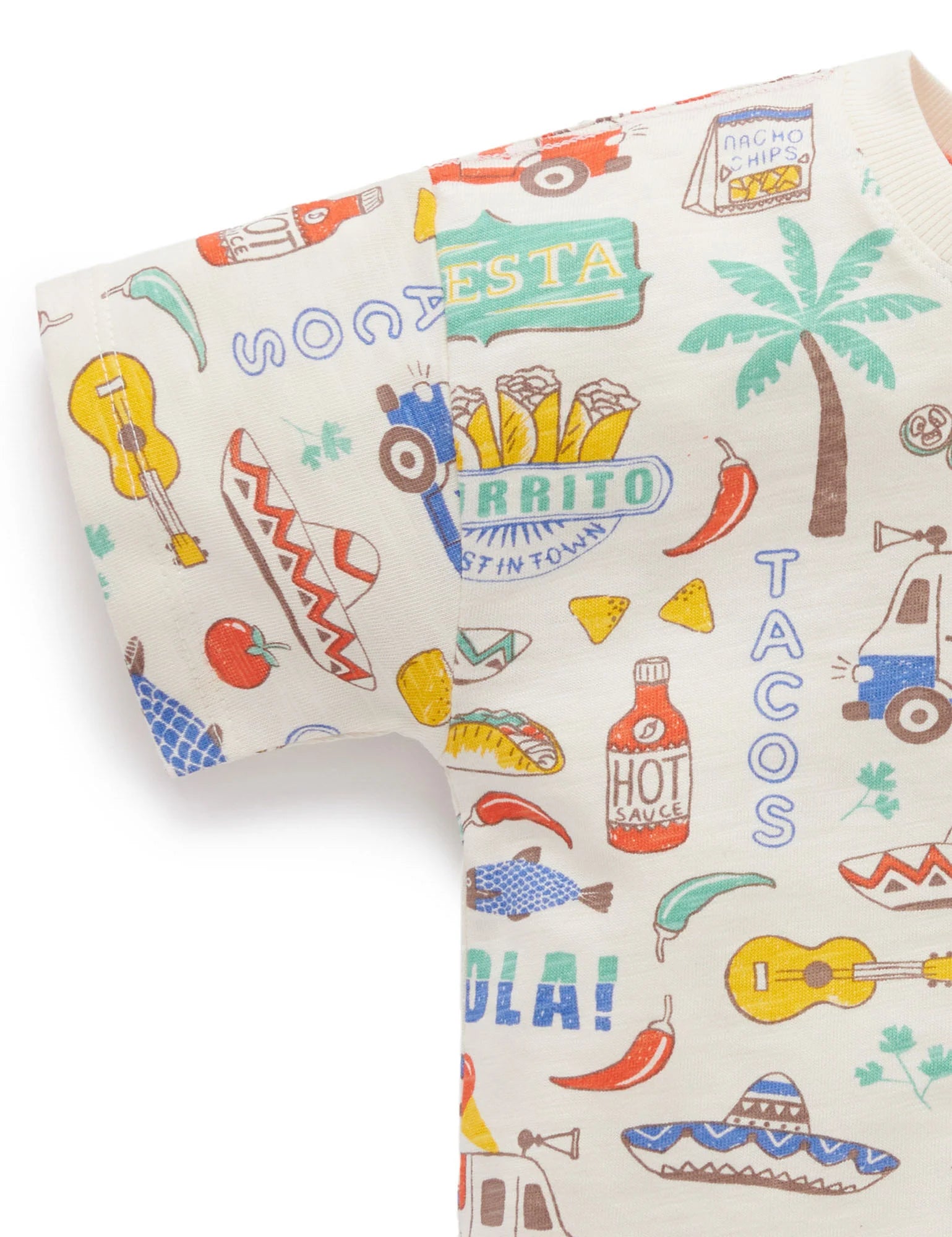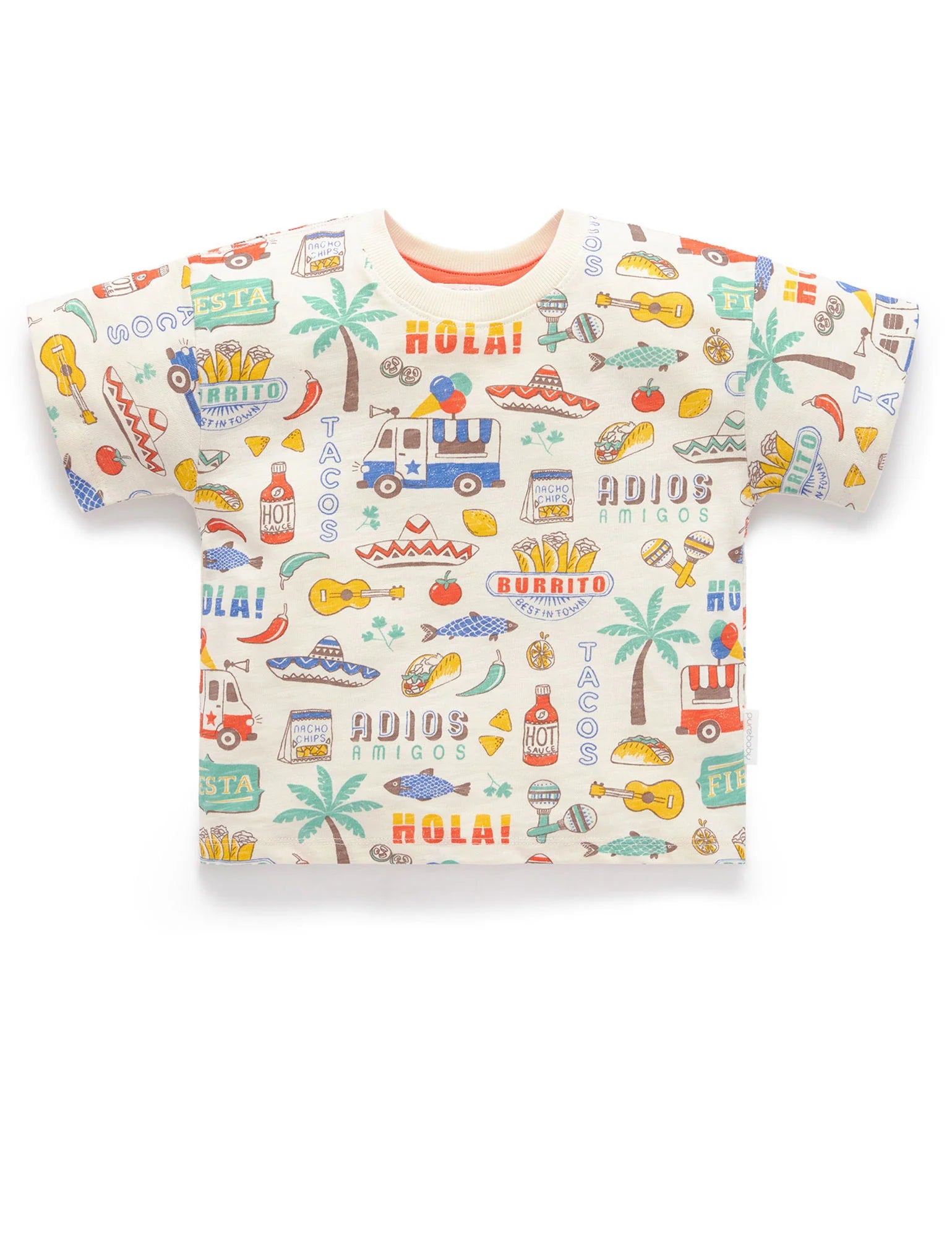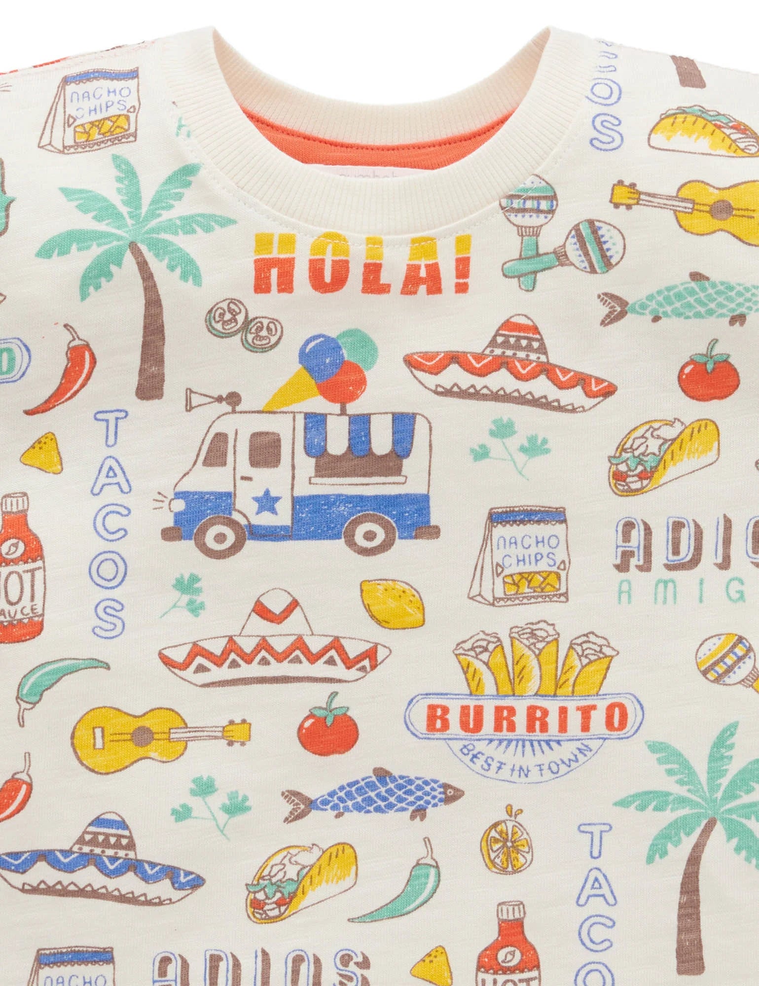 Purebaby's comfy Fiesta Oversized Tee features a fun all over print of yummy Mexican foods! Made from soft 100% Organic Cotton jersey with a slub texture. Designed to be a looser fit, this tee looks great paired with Pull On Shorts for a comfy outfit.