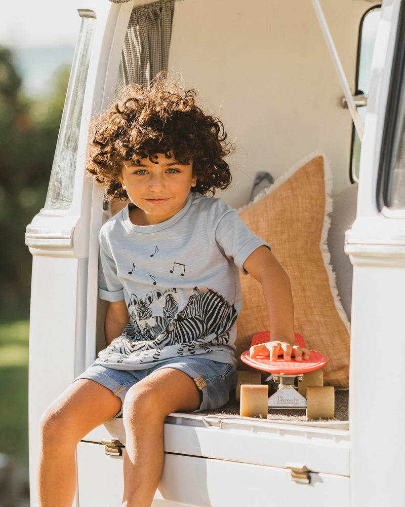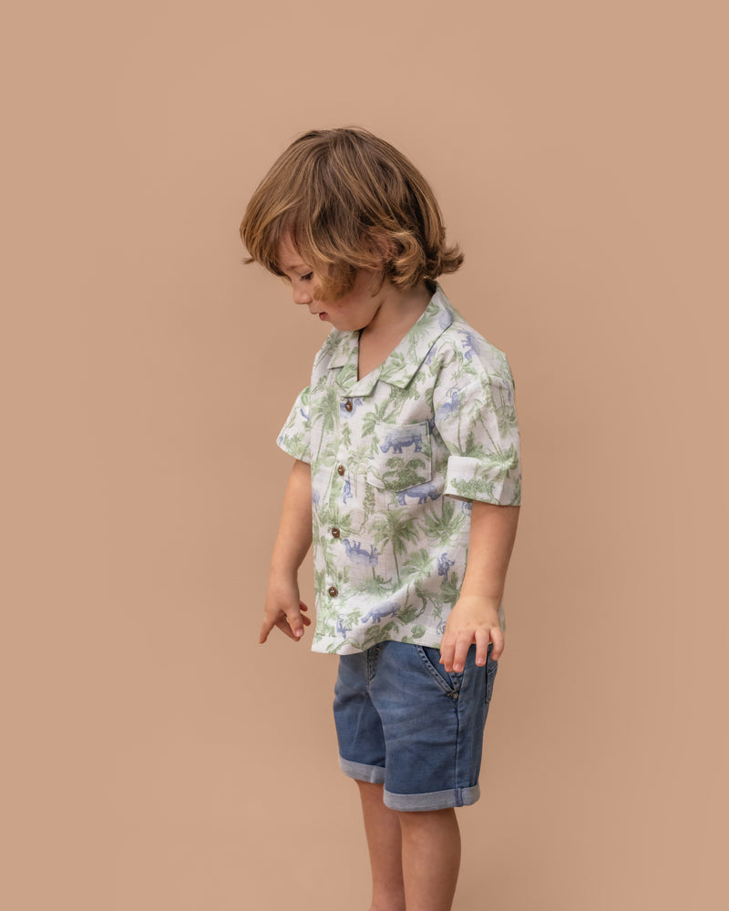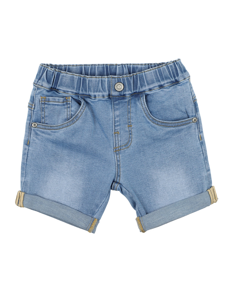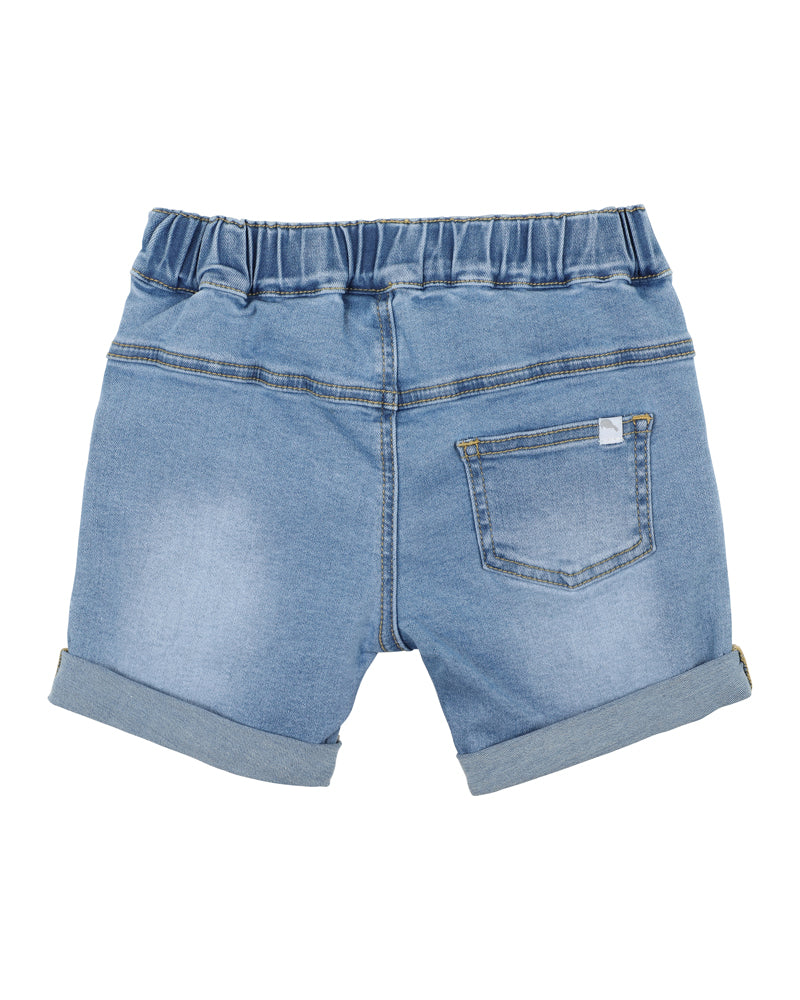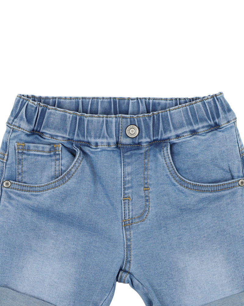 The Racer Denim Shorts from Fox & Finch are a practical mid blue indigo denim short feature an elasticised waist, mock side front pockets back patch pocket and rolled hem cuffs, a staple for any little boy's Summer wardrobe
