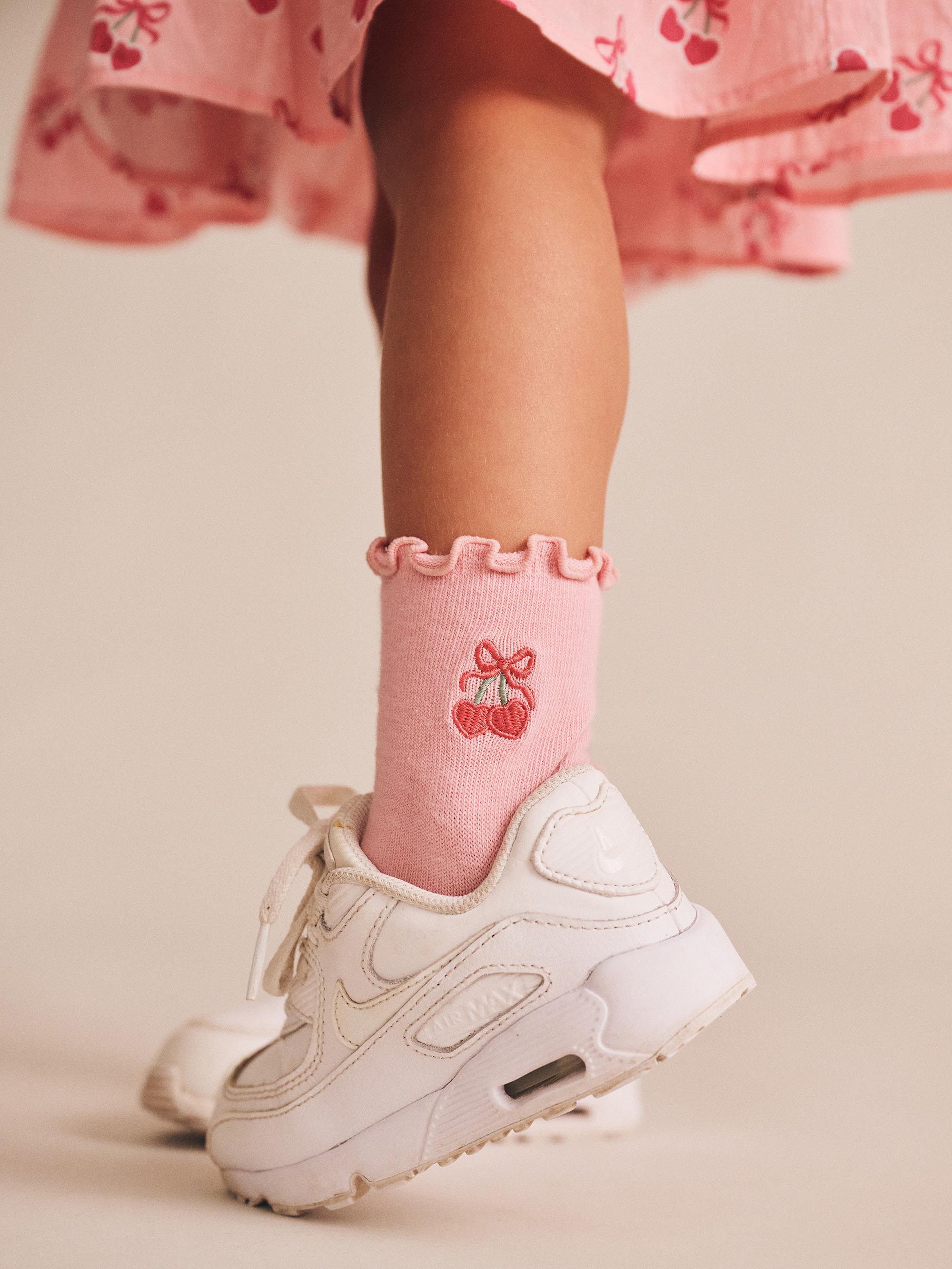 Two pairs of the softest, squishiest ankle socks you’ll ever meet. Made with a breathable blend of fibres to cushion busy feet. These pretty frilly edge socks feature custom festive embroideries. Made with non-slip grippies on baby sizes 6-12 months.
