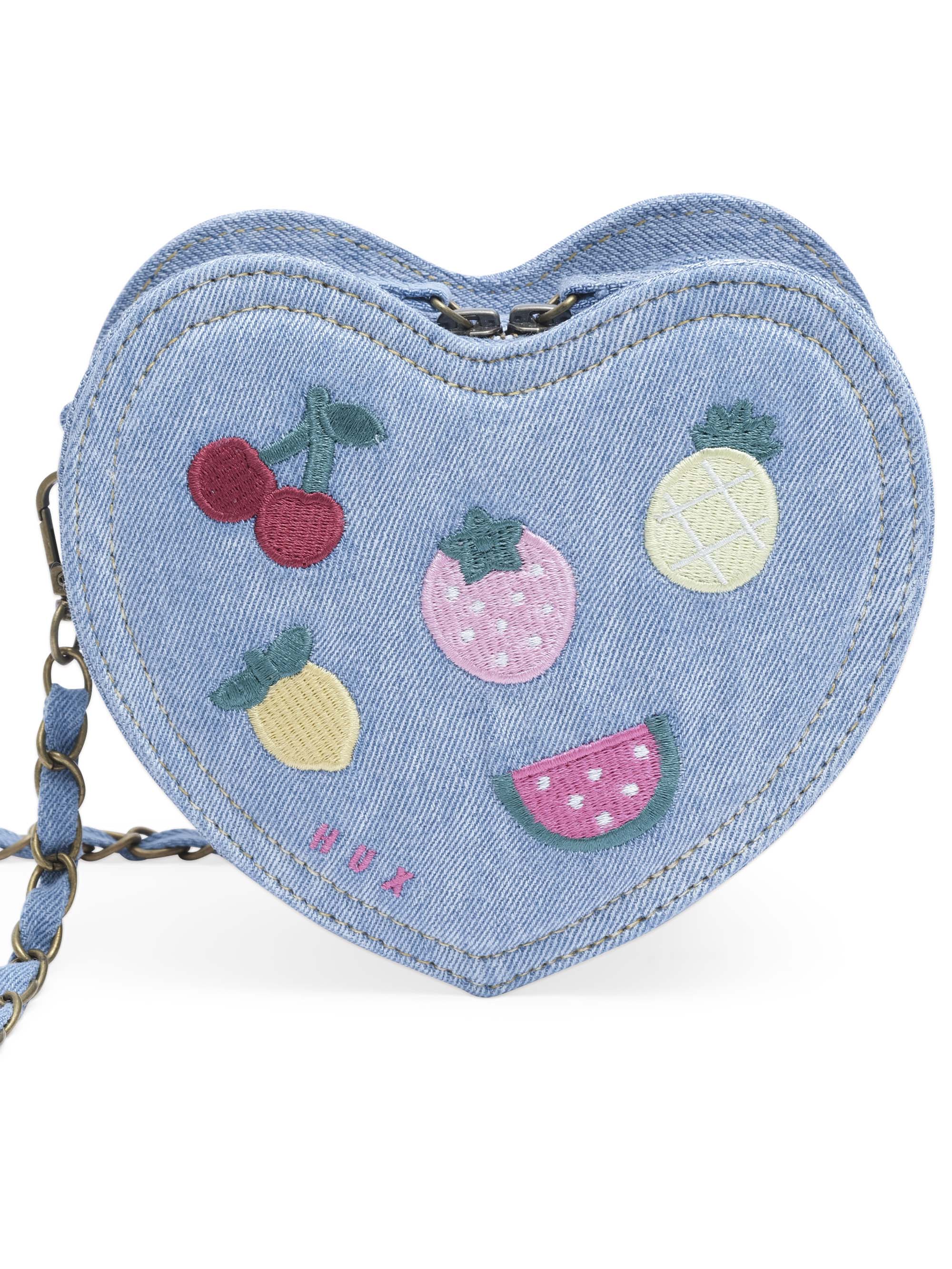 The best handbag to stash snacks, pebbles or any other playground treasures this season is from Huxbaby! Retro 90s style denim cross shoulder design with embroidered fruit detailing. Includes "Hux Bux" play money inside.