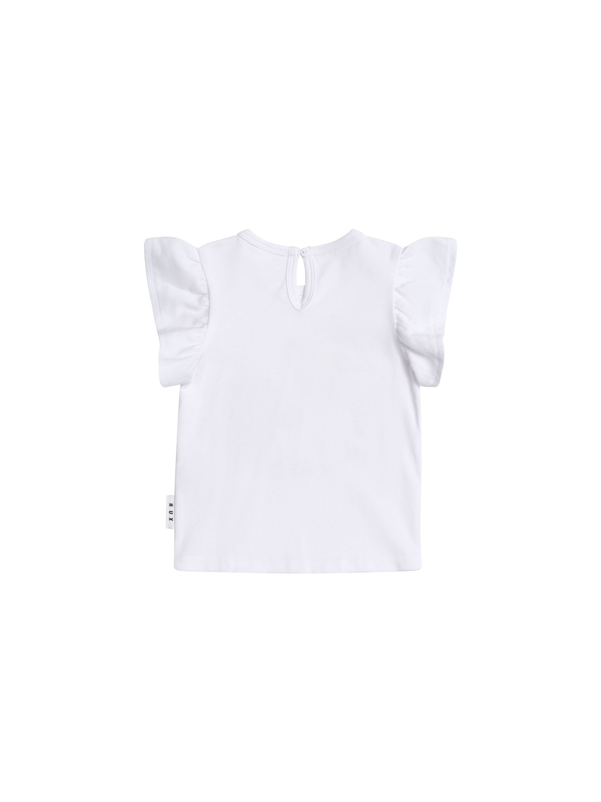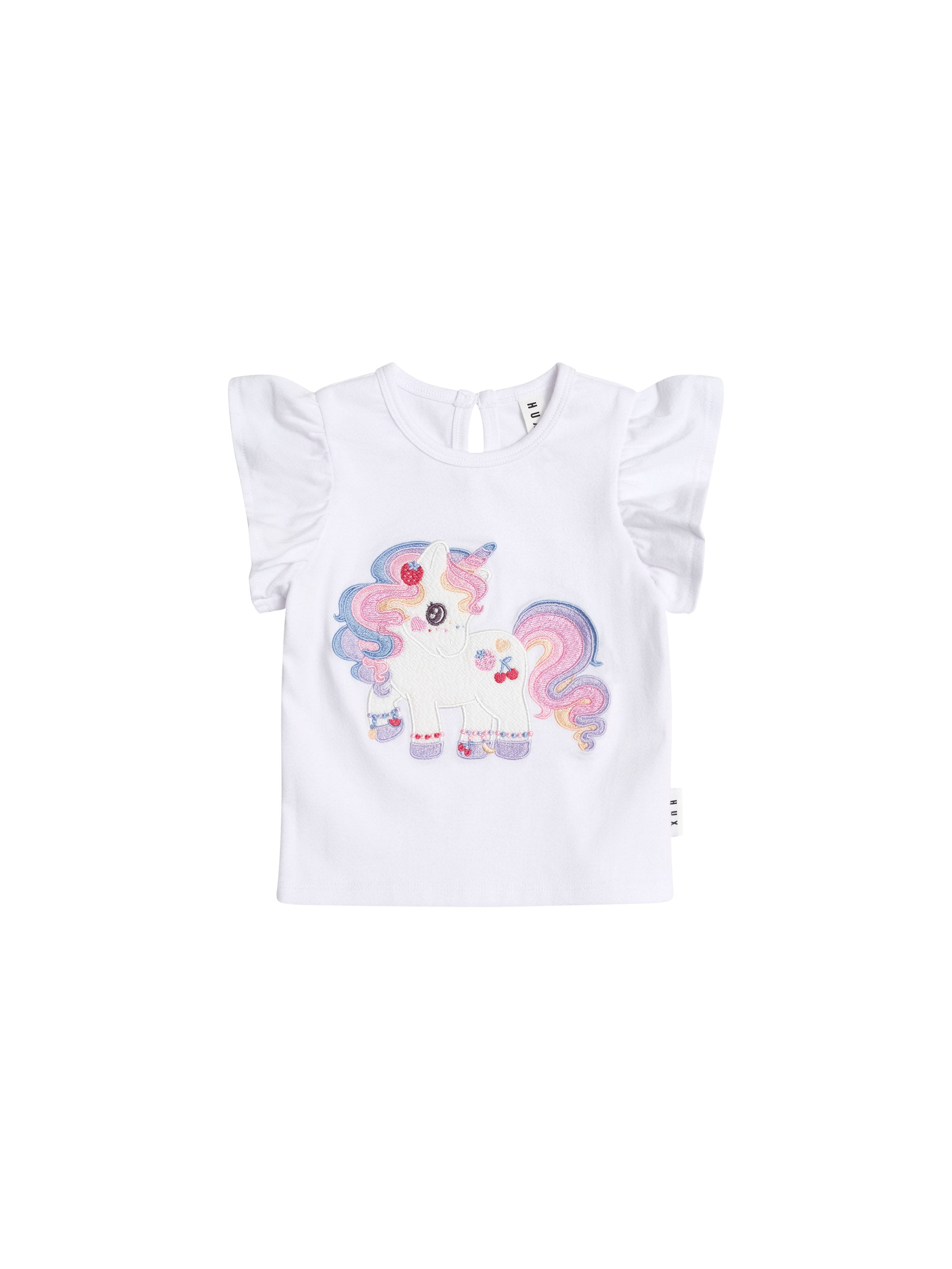 An extra special everyday tee from Huxbaby! Its crafted from the comfiest organic cotton with just the right amount of stretch. It has a shoulder frill detail and sparkly tutti frutti unicorn embroidery.