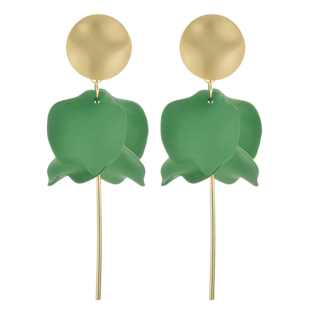 Discover the essence of boho chic with our matte gold/green, flower petal stud top dangle earrings. Embrace free-spirited style with these intricately crafted earrings that seamlessly blend bohemian inspiration and modern elegance. The delicate flower petals provide a touch of nature, while the dangling design adds a playful flair. Elevate your look and express your individuality with these boho-inspired earrings – the perfect light weight earring this season.
