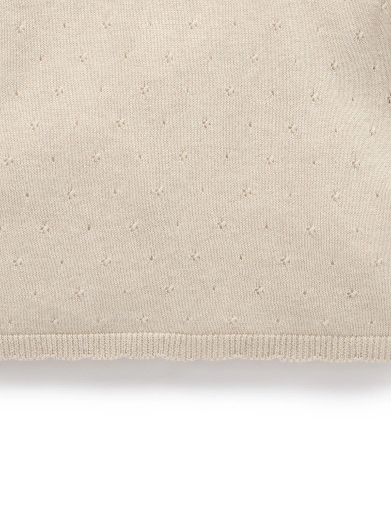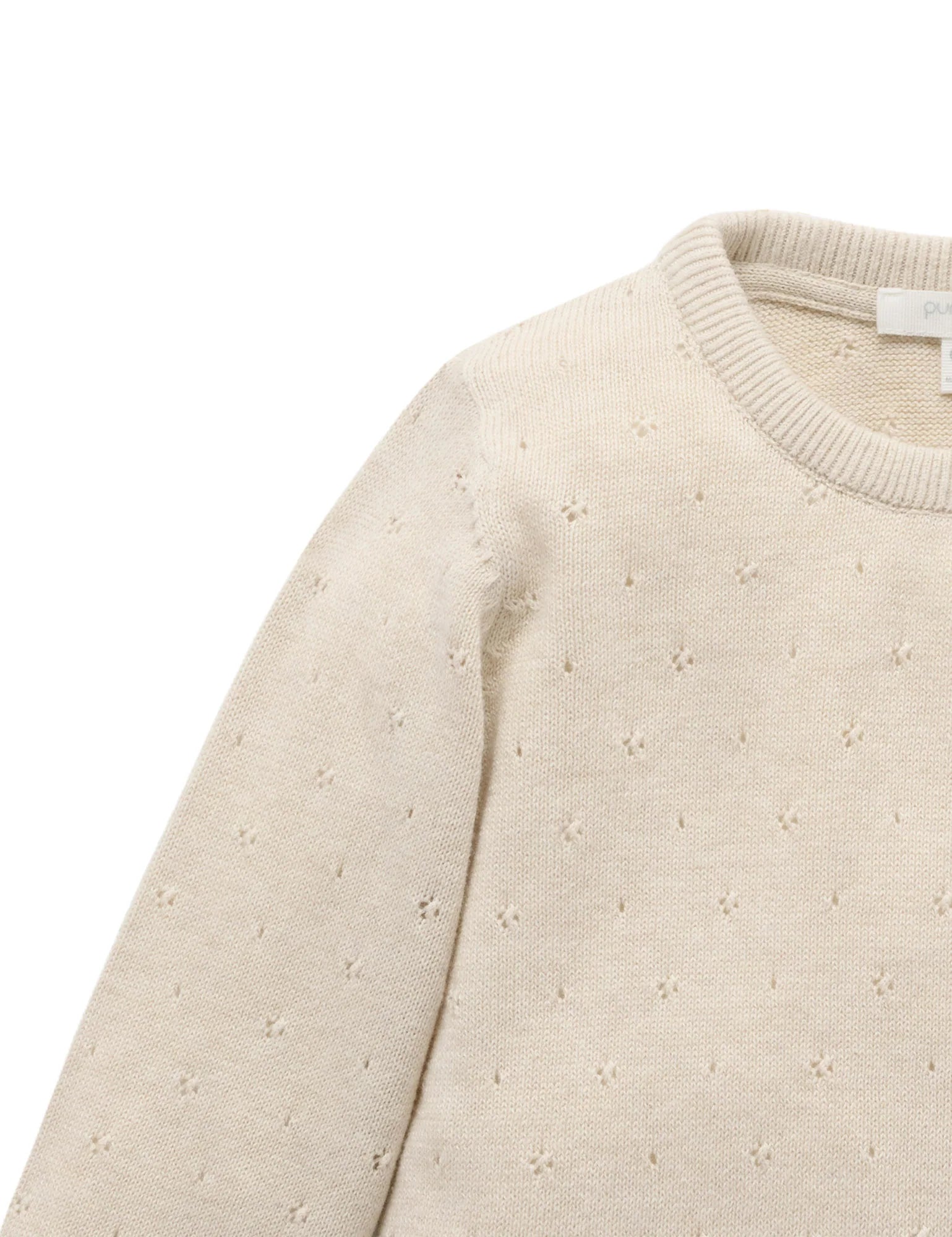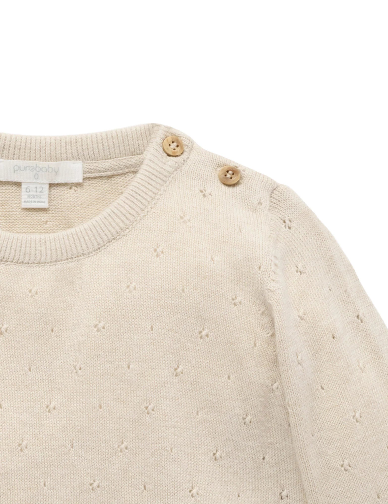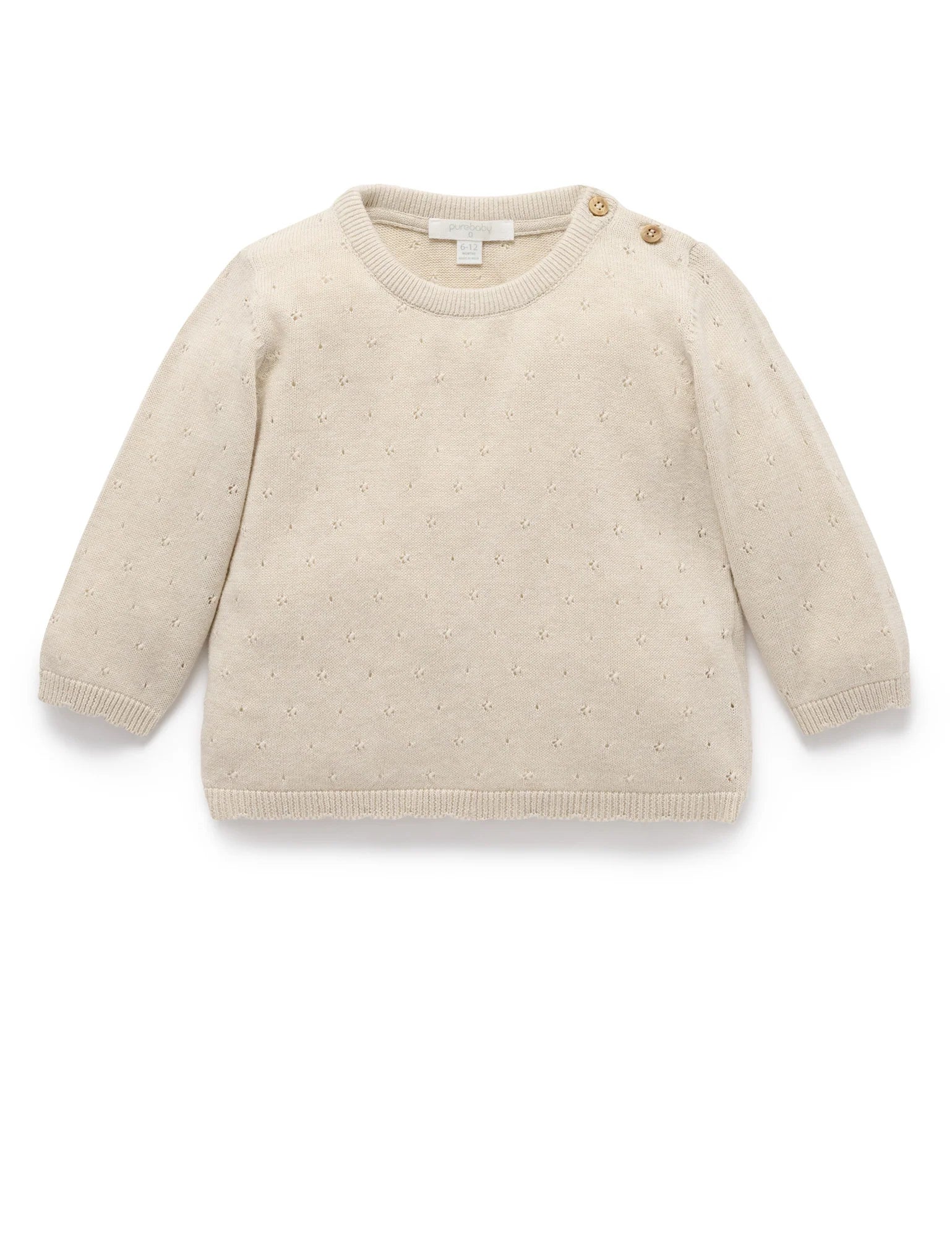 Purebaby's Eyelet Jumper is a classic style that's great worn on it's own or layered underneath outerwear. Knitted in an eyelet detail stitch, this is a close fitting style to keep little bodies warm. Made in soft organic cotton yarn with a touch of wool, this is a comfortable jumper that won't itch.