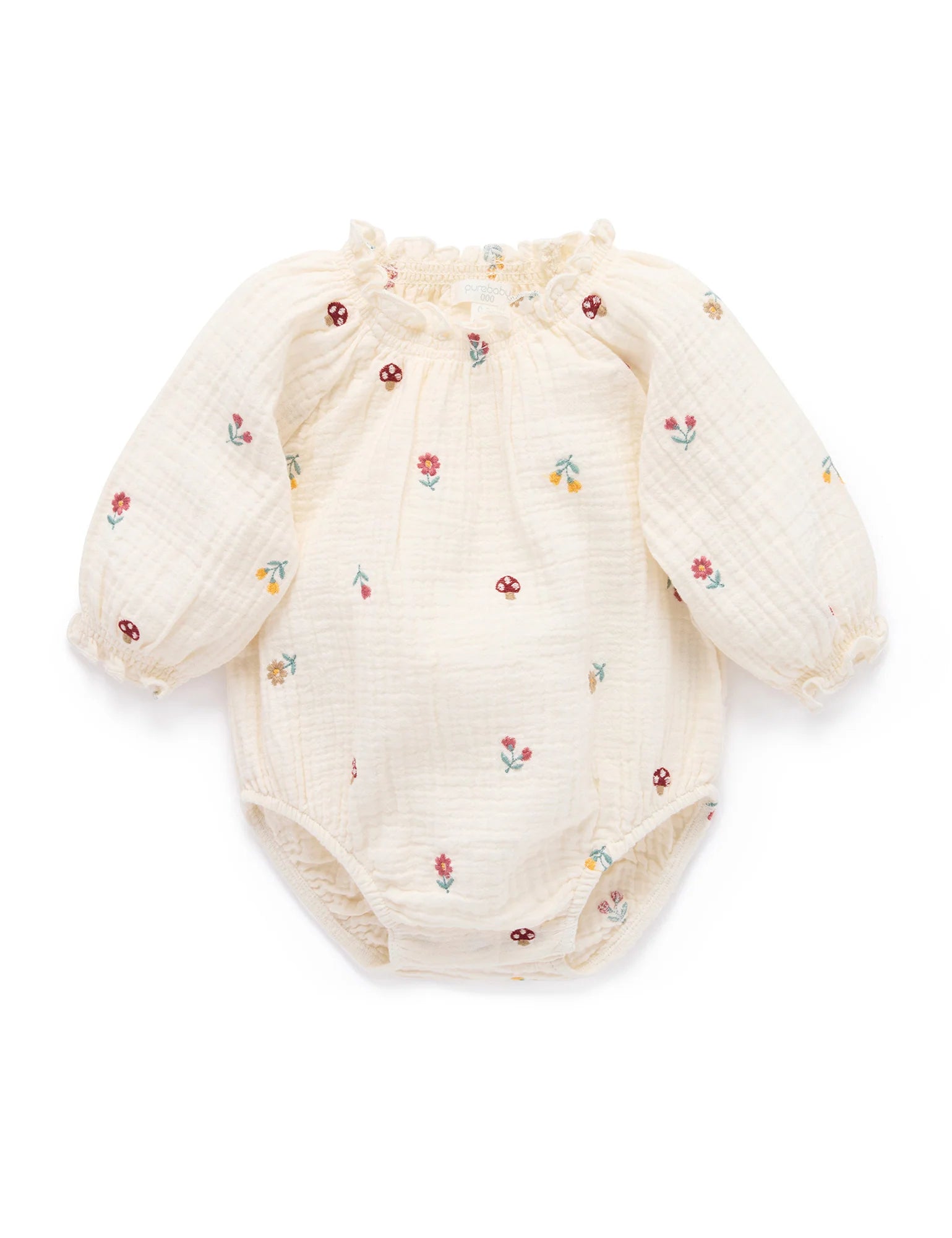 Purebaby's Forest Embroidered Bodysuit is a sweet all-in-one style for those special occasions with your little one. Featuring a pretty all over toadstool and flower embroidery, designed in a balloon style with smocking at the collar and cuffs. Made from soft 100% Organic Crinkle Cotton. Pair with a cardigan, tights and Bow Headband for a sweet look.